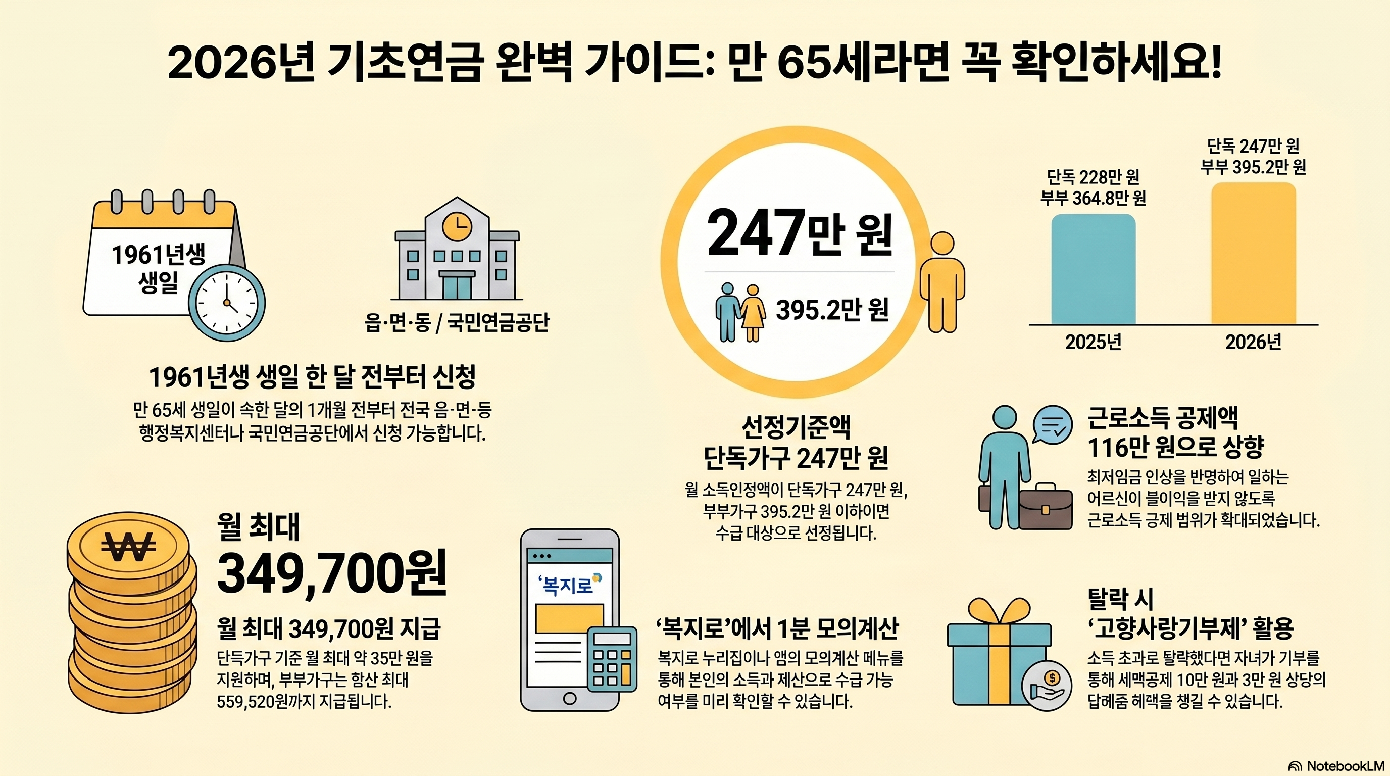 65세가 넘었는데 매달 통장에 35만 원이 추가로 들어온다면 어떨까요? 기초연금은 조건만 맞으면 신청만으로 받을 수 있는 나라 지원금입니다. 그런데 모르거나 미뤄서 못 받는 분들이 생각보다 많습니다. 2026년에는 금액도 오르고 조건도 바뀝니다. 지금 바로 내가 해당되는지 확인해 보세요.